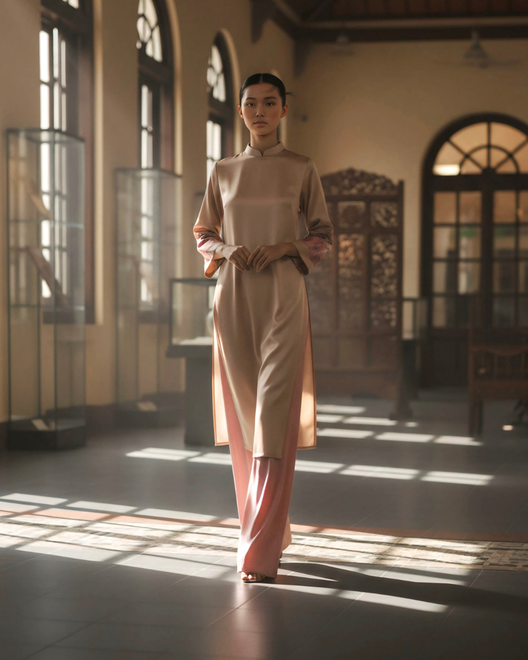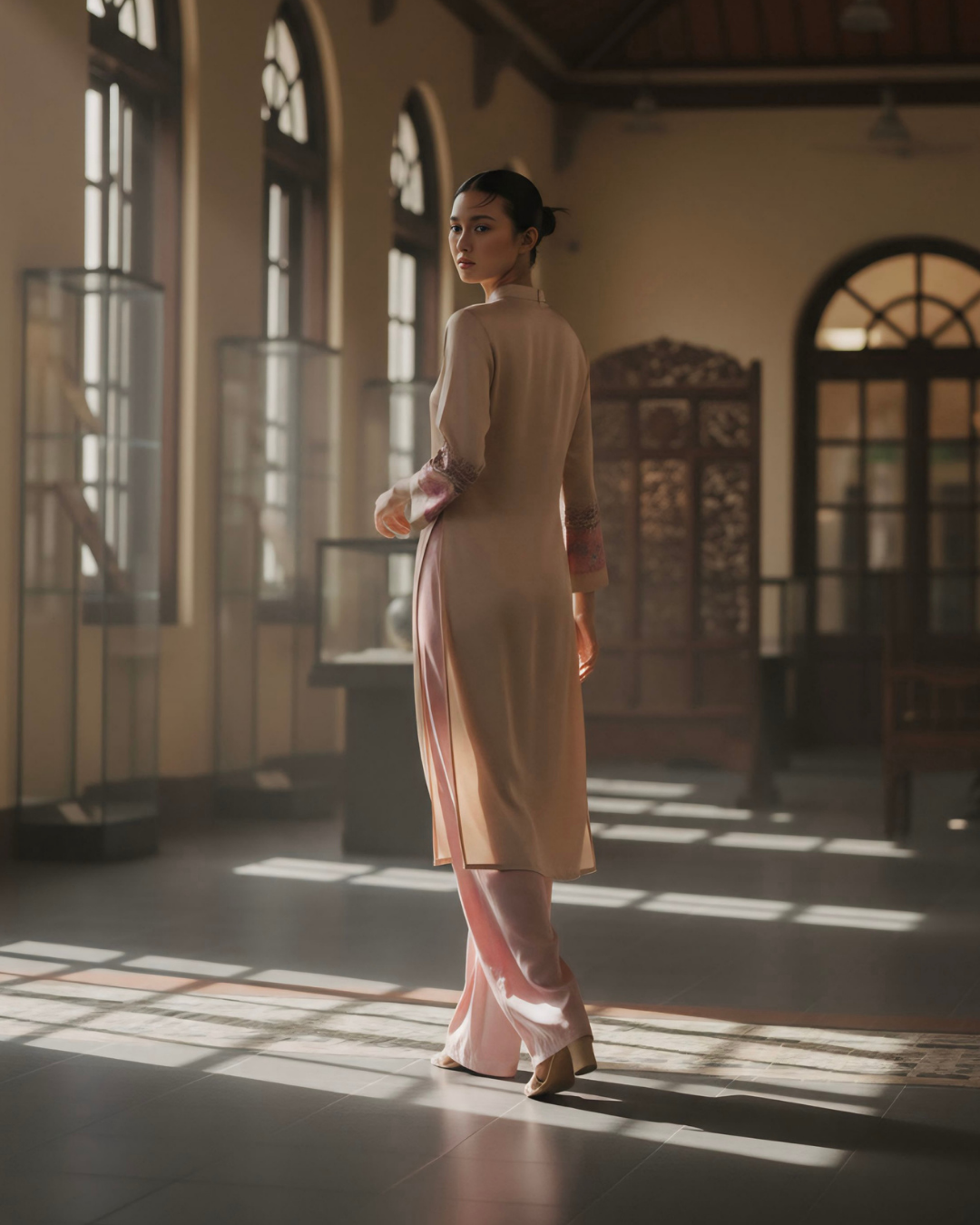Bộ sưu tập sử dụng lụa tơ tằm Bảo Lộc thượng hạng, được dệt và nhuộm thủ công bằng kỹ thuật organic. Chất lụa hai mặt bóng mịn, mát lạnh khi chạm vào da, nhẹ như hơi thở và mềm như ánh sương. Mỗi thớ lụa mang trong mình linh hồn của làng nghề, nơi trái tim người thợ gửi gắm cả niềm tự hào dân tộc.