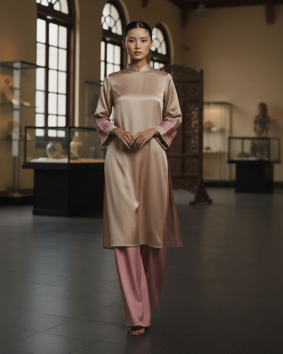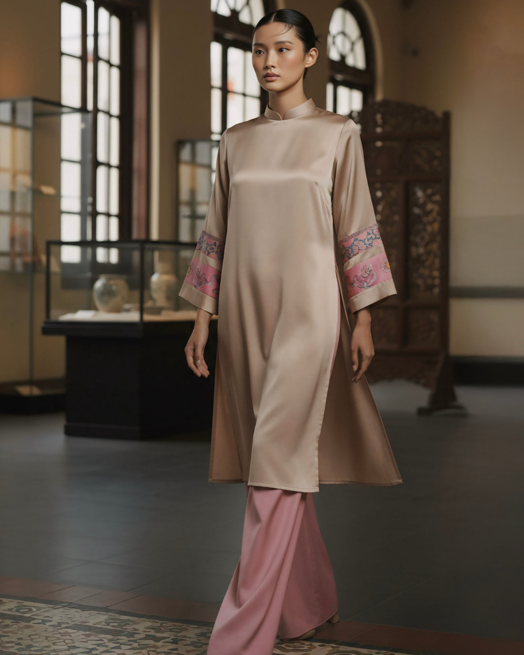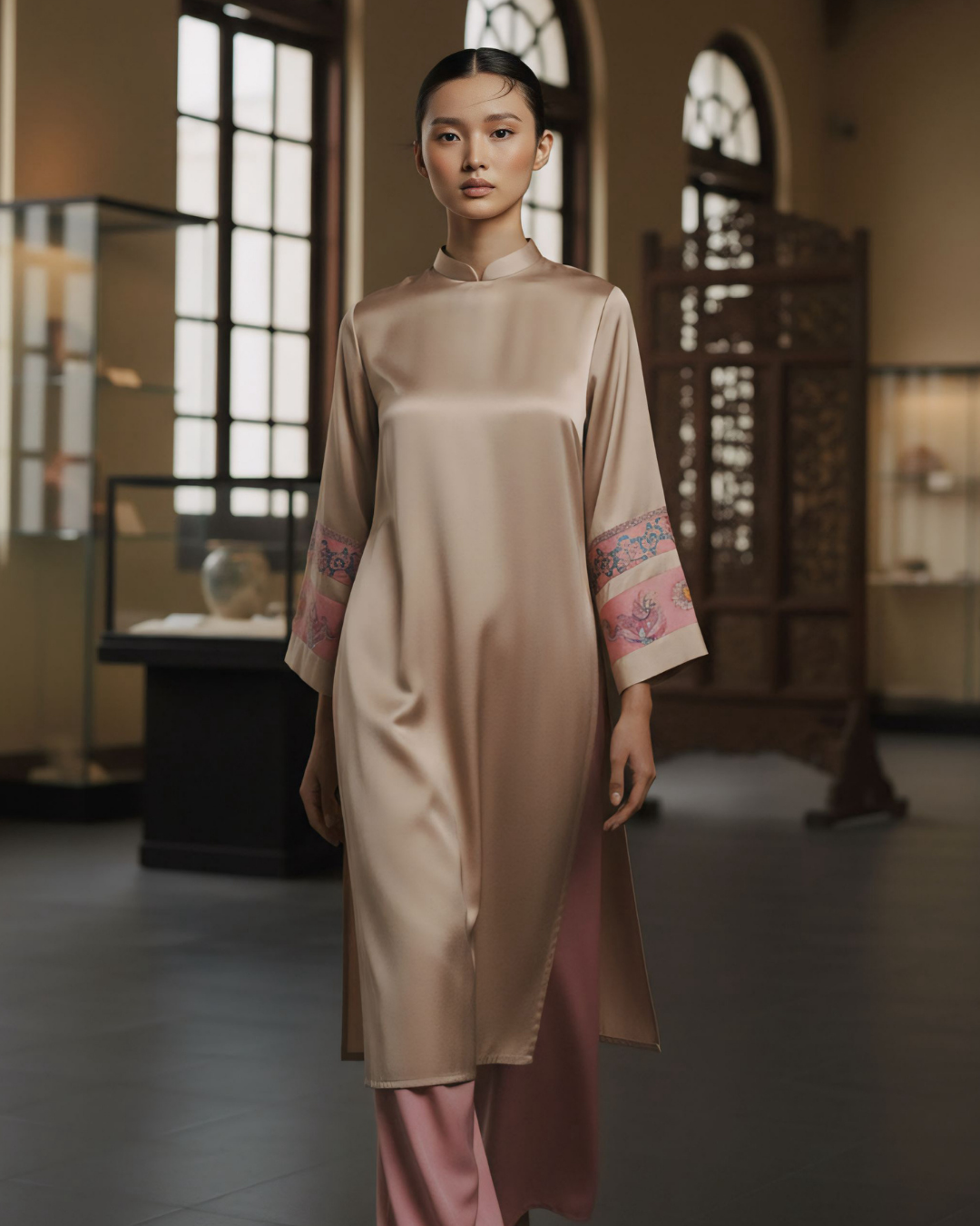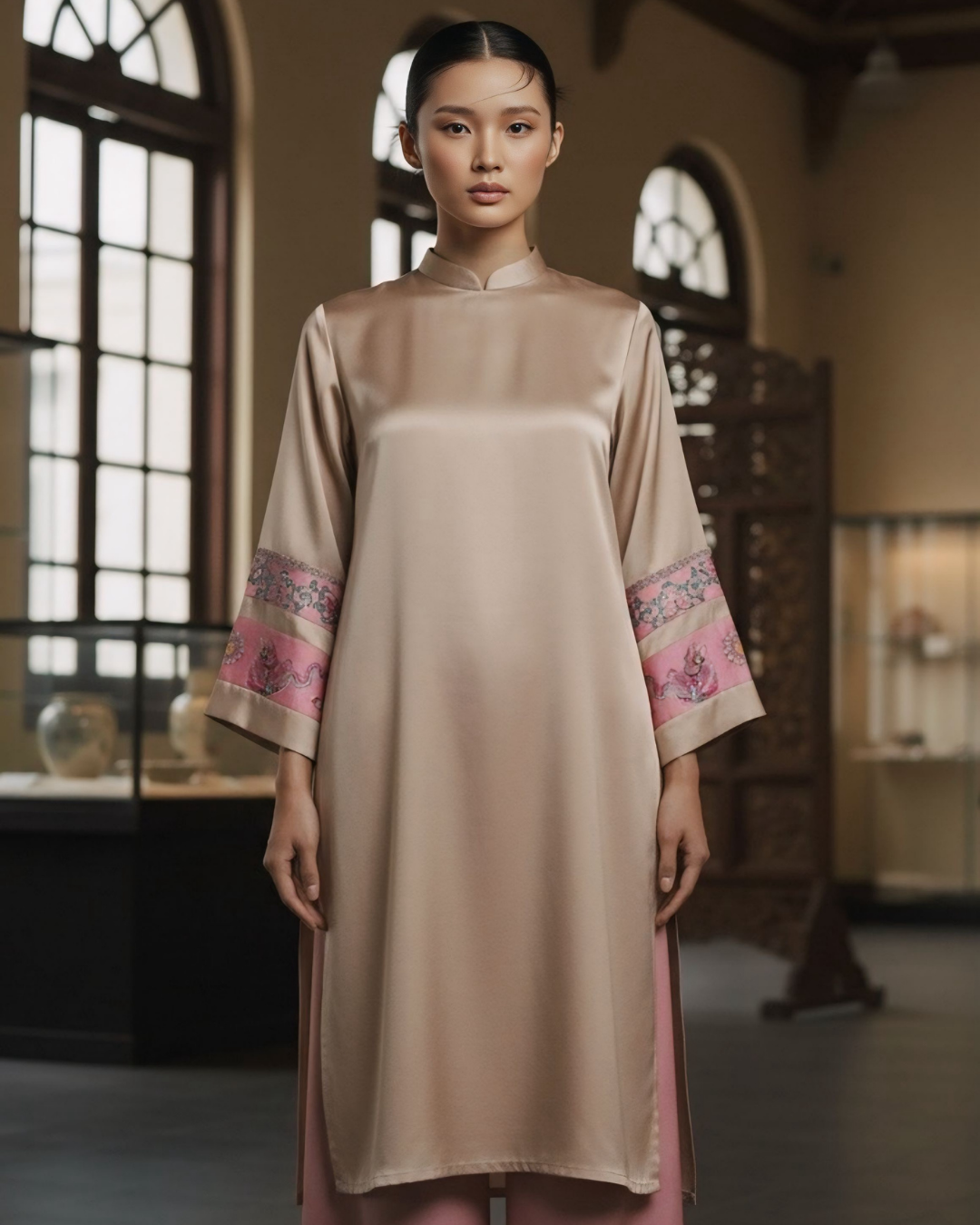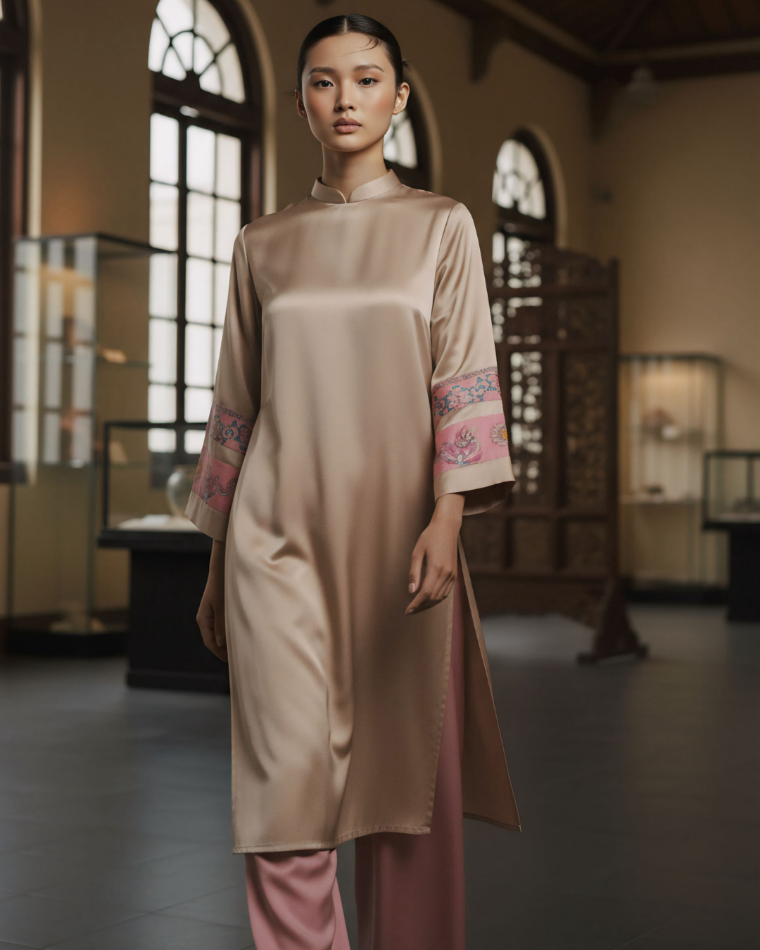 Áo Dài Lụa Tay Loa / Họa tiết Lụa Trơn Be Hồng & Twilly Phụng Vũ Vân Ca Hồng
