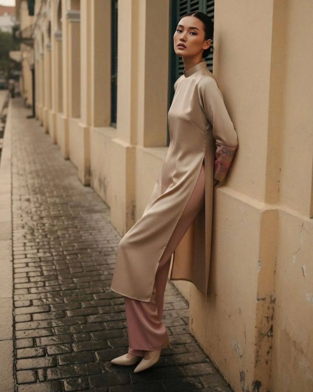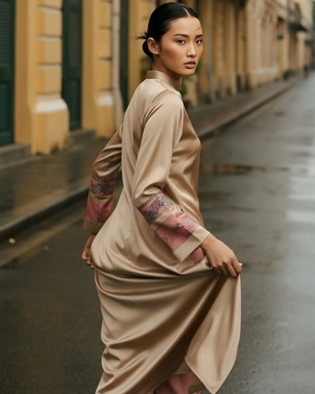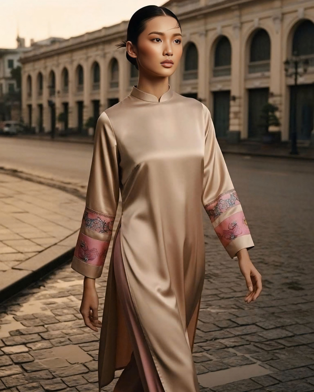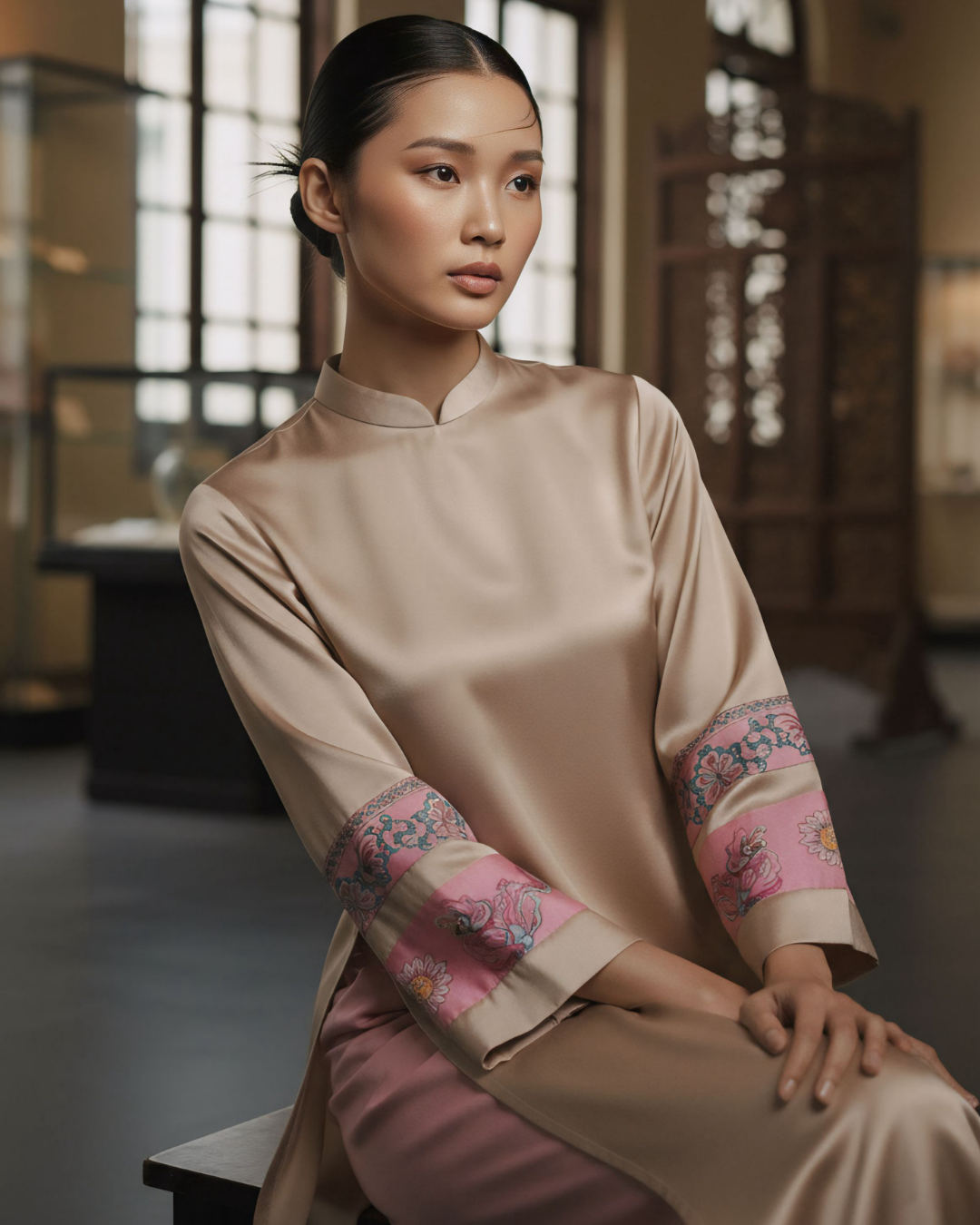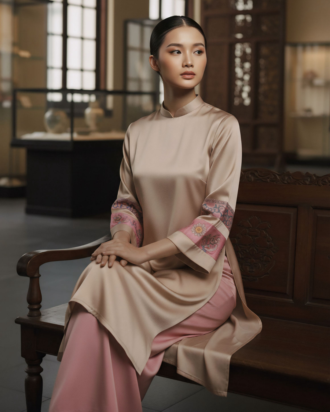 Áo Dài Lụa Tay Loa / Họa tiết Lụa Trơn Be Hồng & Twilly Phụng Vũ Vân Ca Hồng