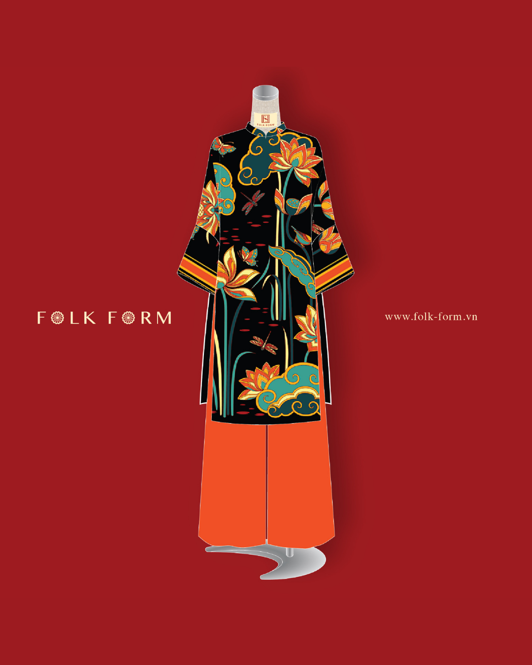 Áo Dài Tay Loa / Họa tiết Cố Đô Liên Hoạ Đen & Da Cam