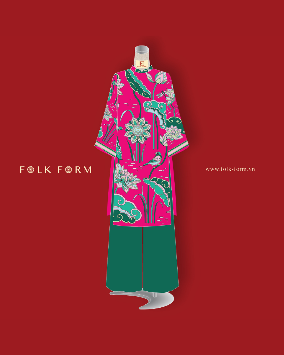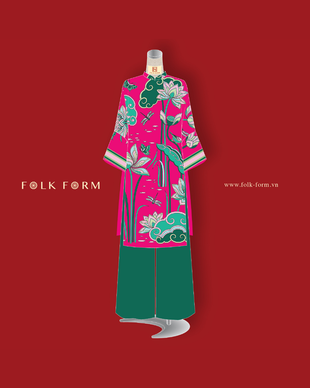 Áo Dài Tay Loa / Họa tiết Cố Đô Liên Hoạ Hồng & Xanh Lá