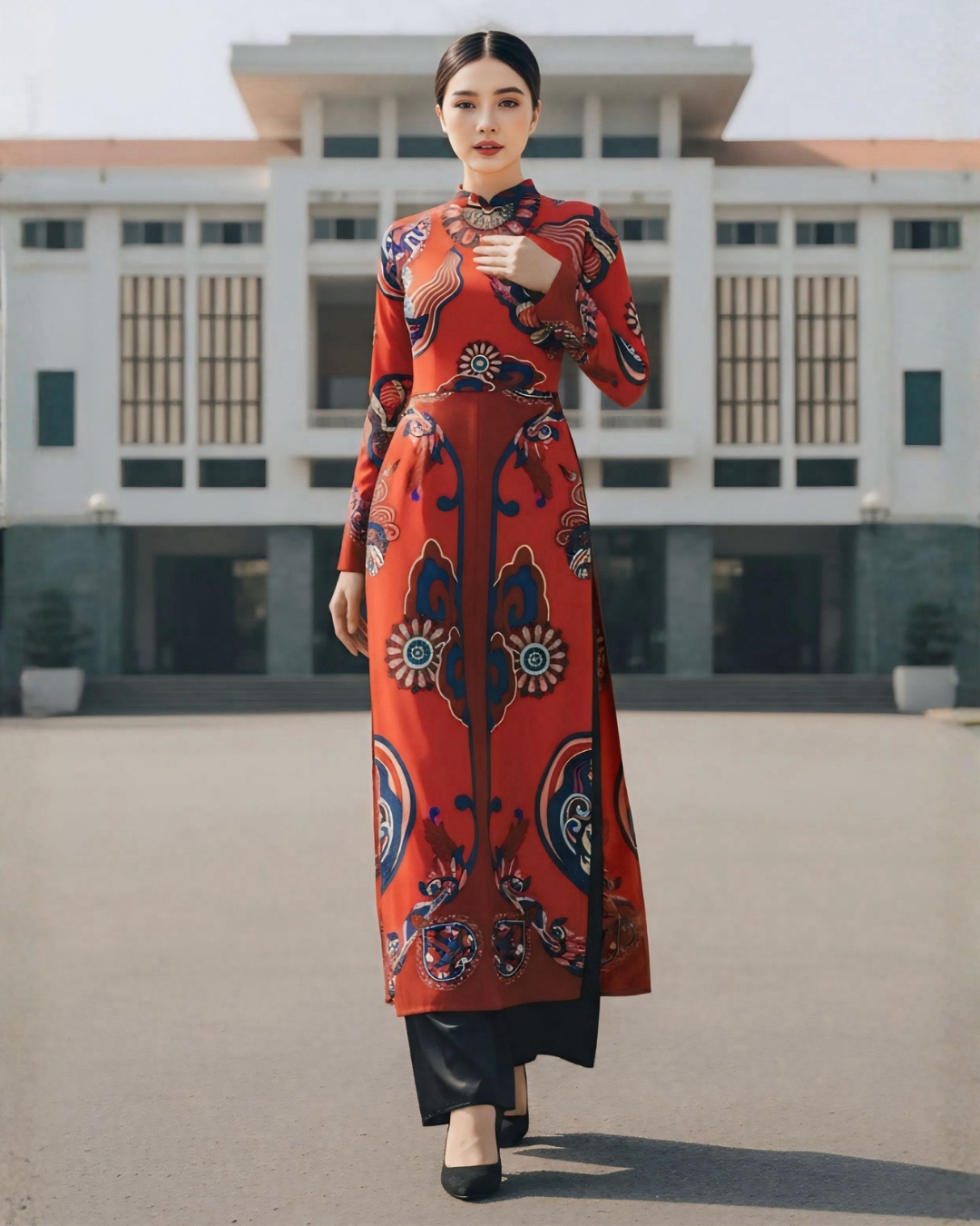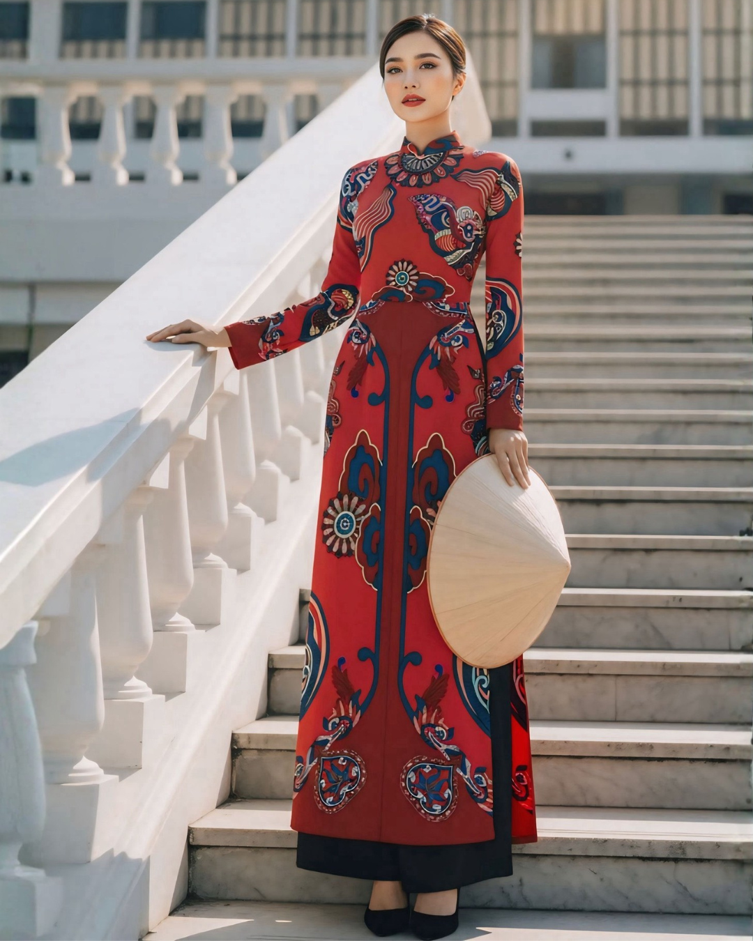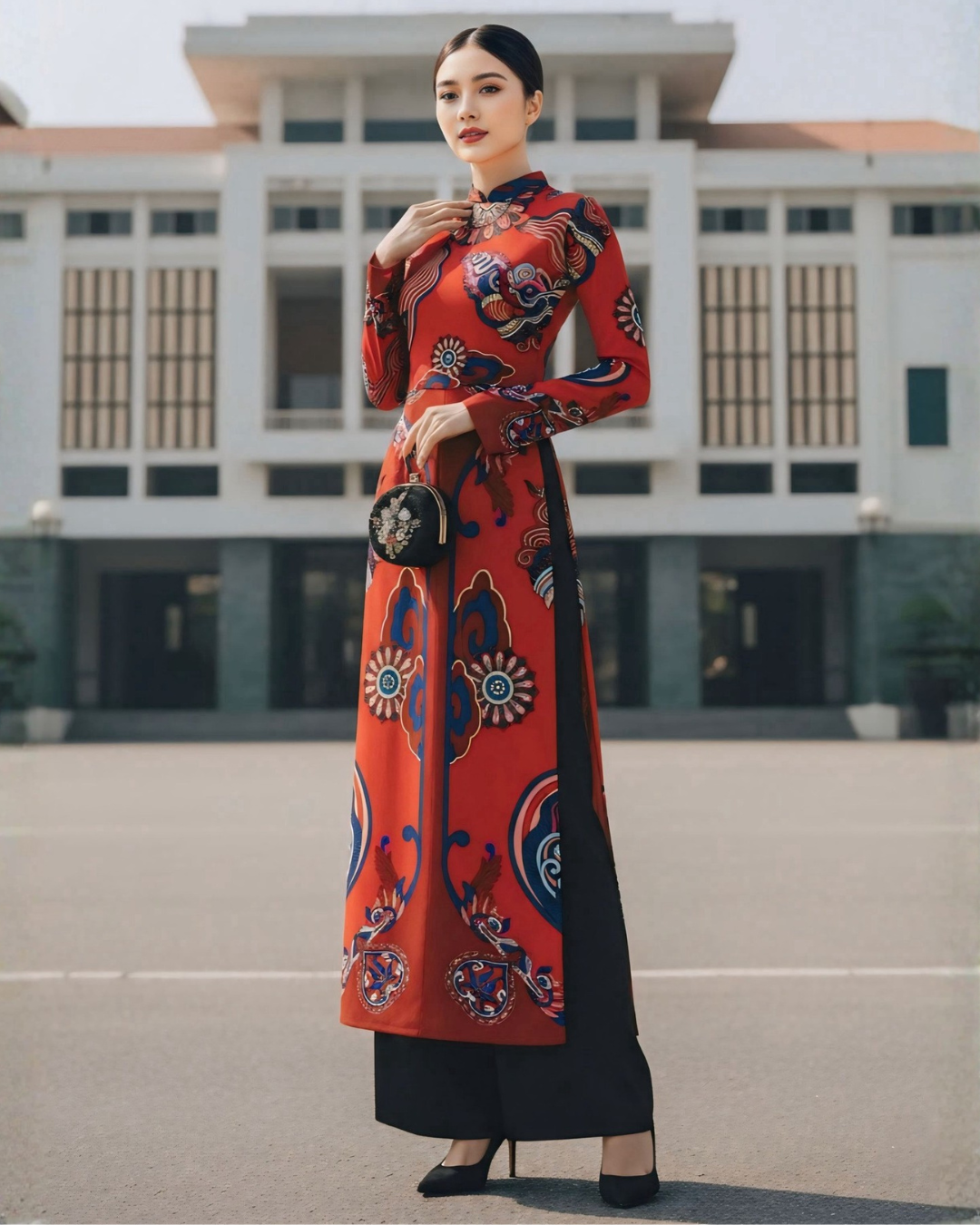 Áo Dài Lụa Truyền Thống / Họa tiết Hương Vân Long Mộng Đỏ