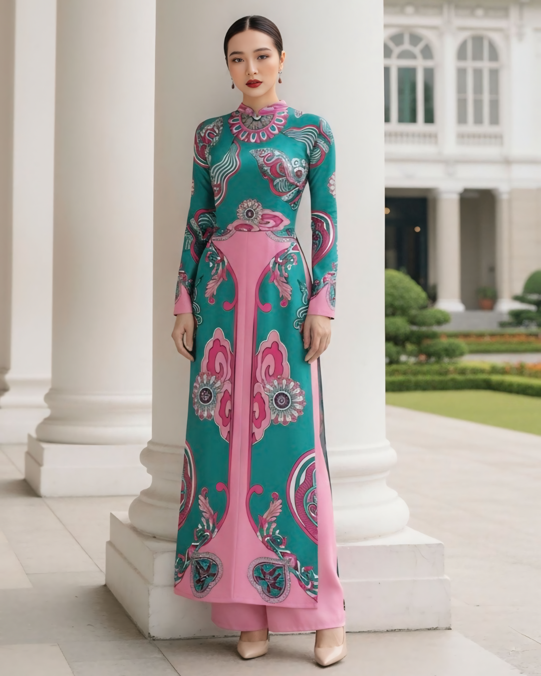 Áo Dài Lụa Truyền Thống / Họa tiết Hương Vân Long Mộng Xanh Ngọc & Hồng