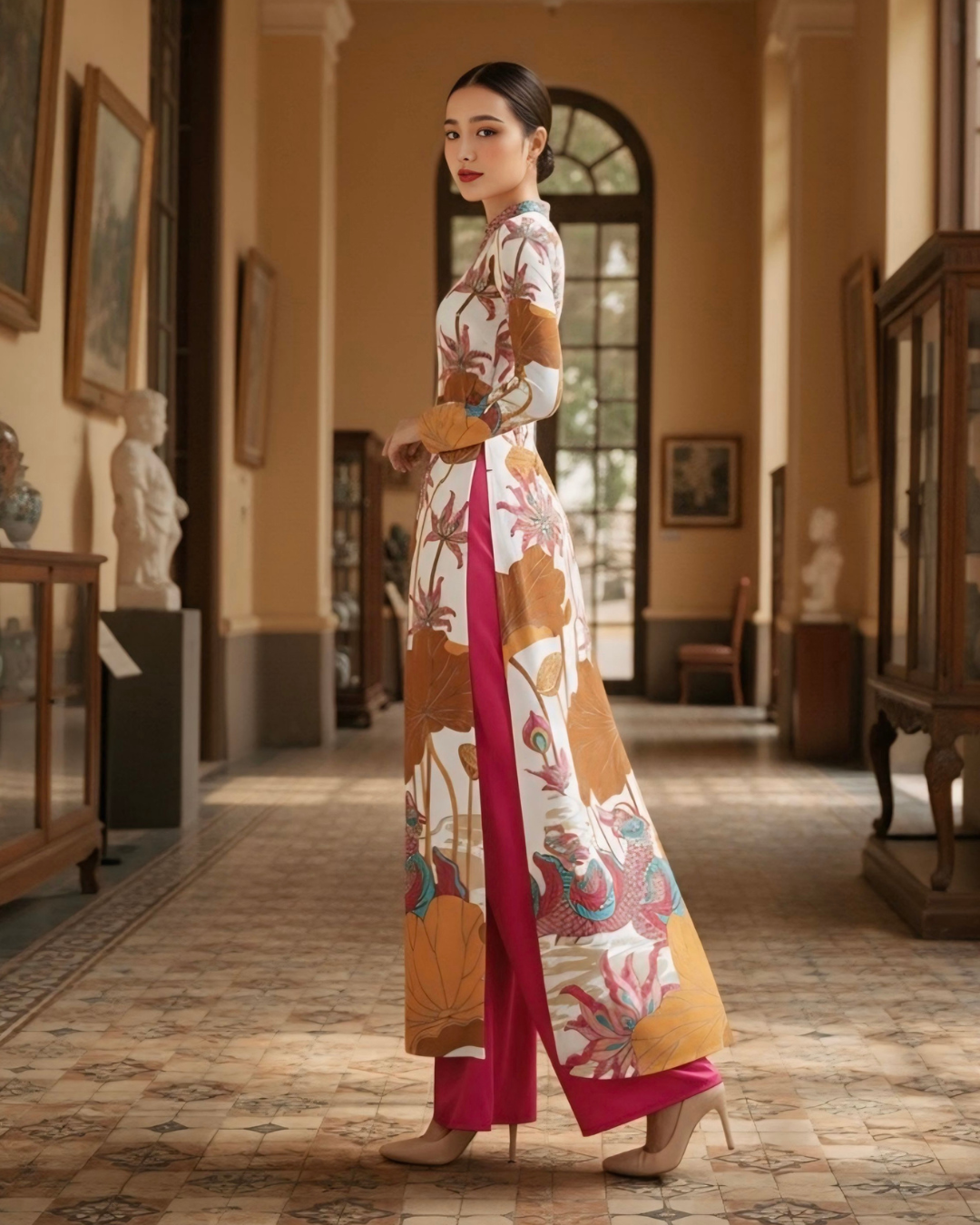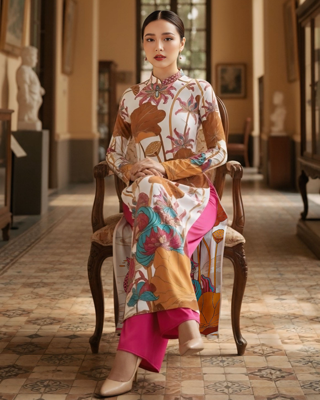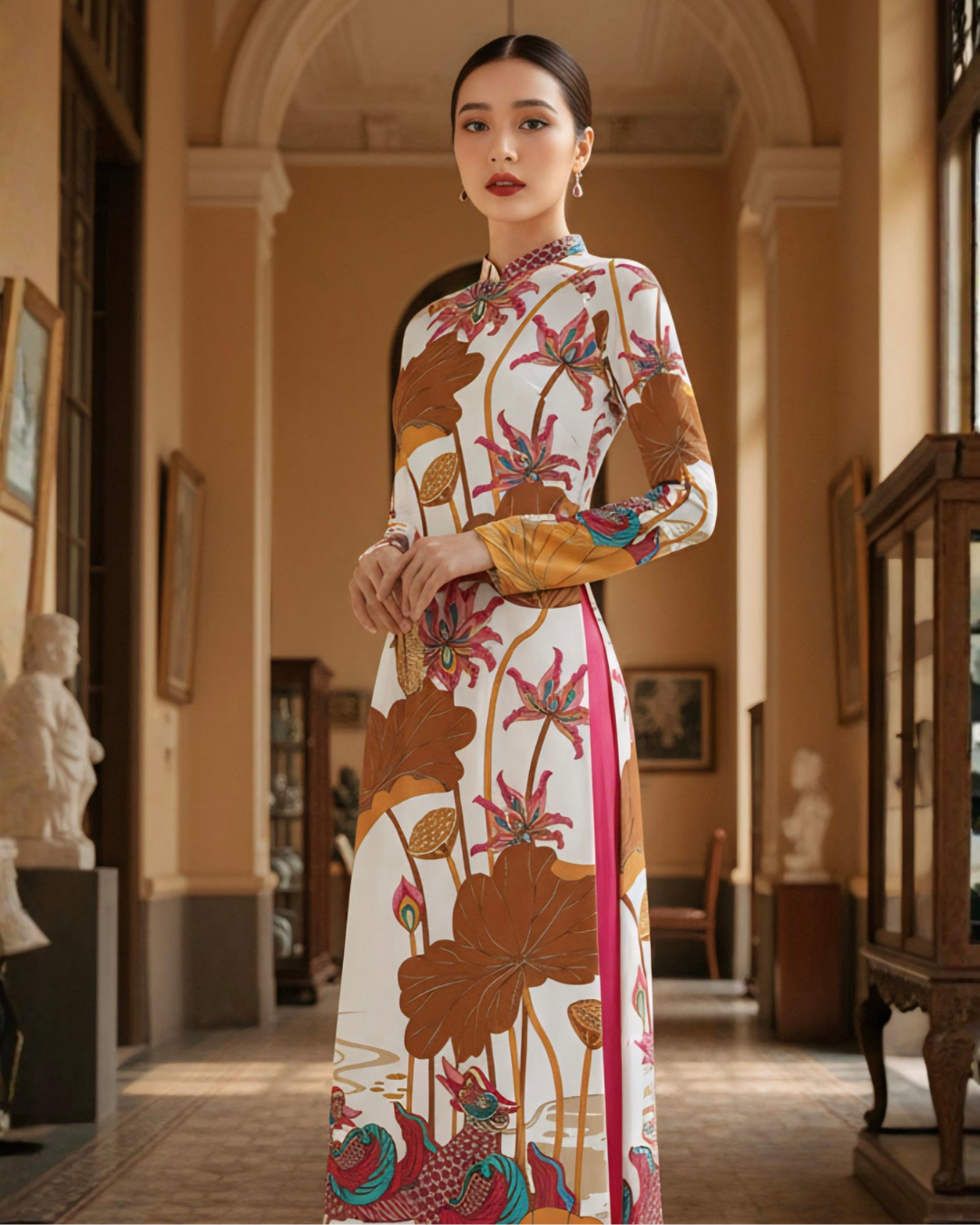Áo Dài Lụa Truyền Thống / Họa tiết Uyên Ương Liên Hạ Be & Nâu
