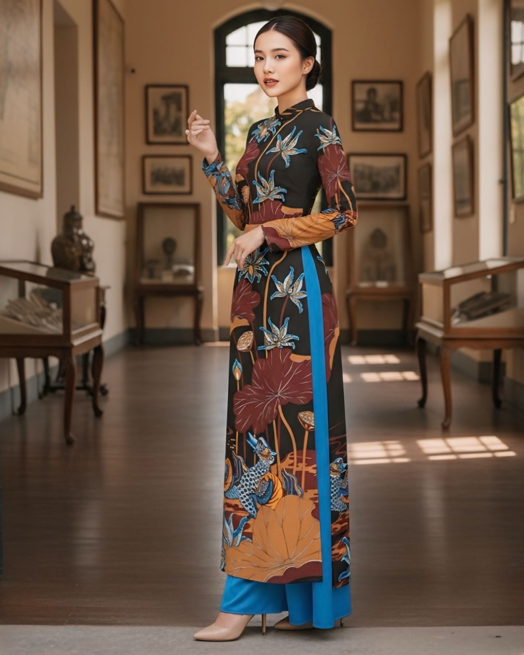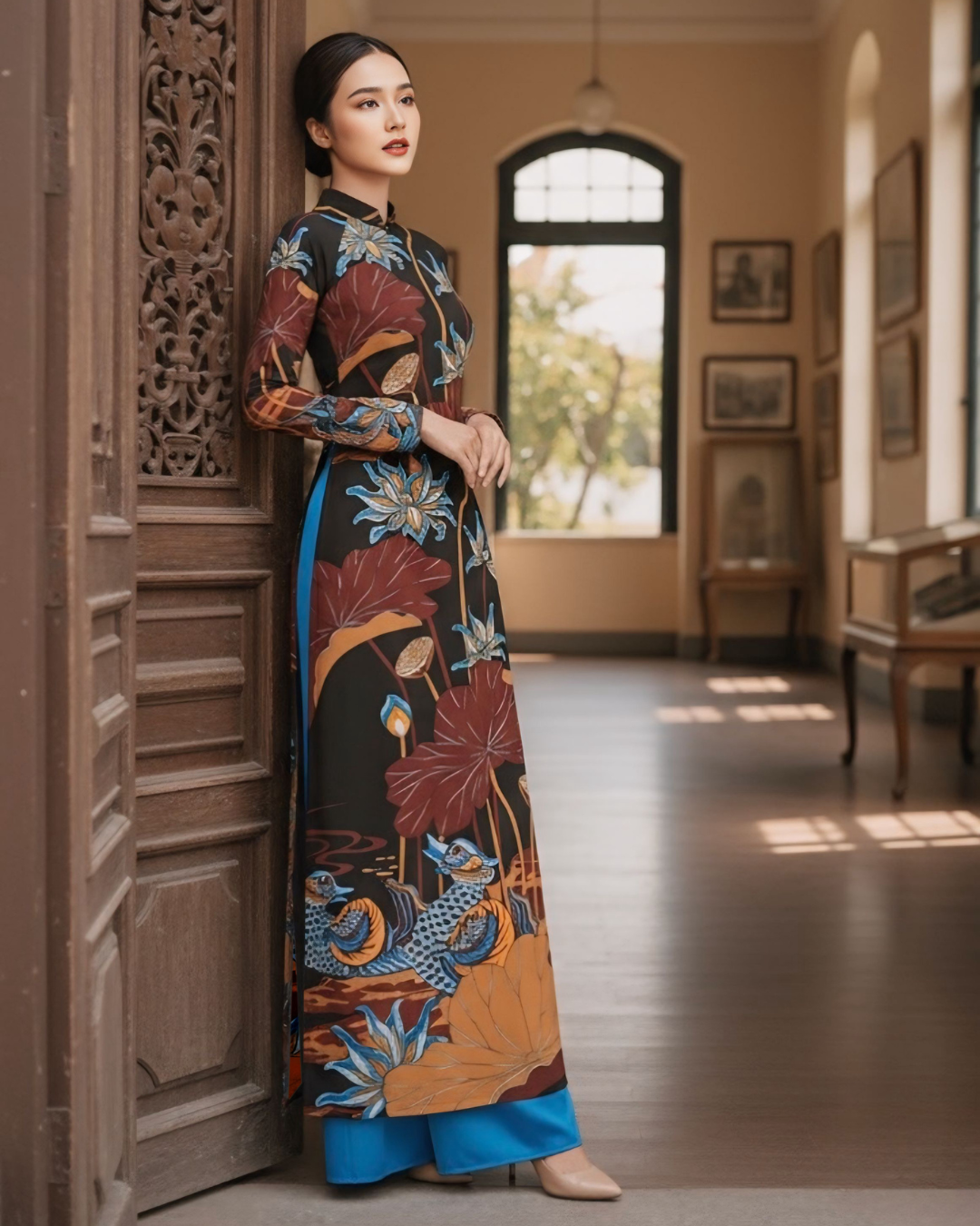 Áo Dài Lụa Truyền Thống / Họa tiết Uyên Ương Liên Hạ Nâu & Da Cam