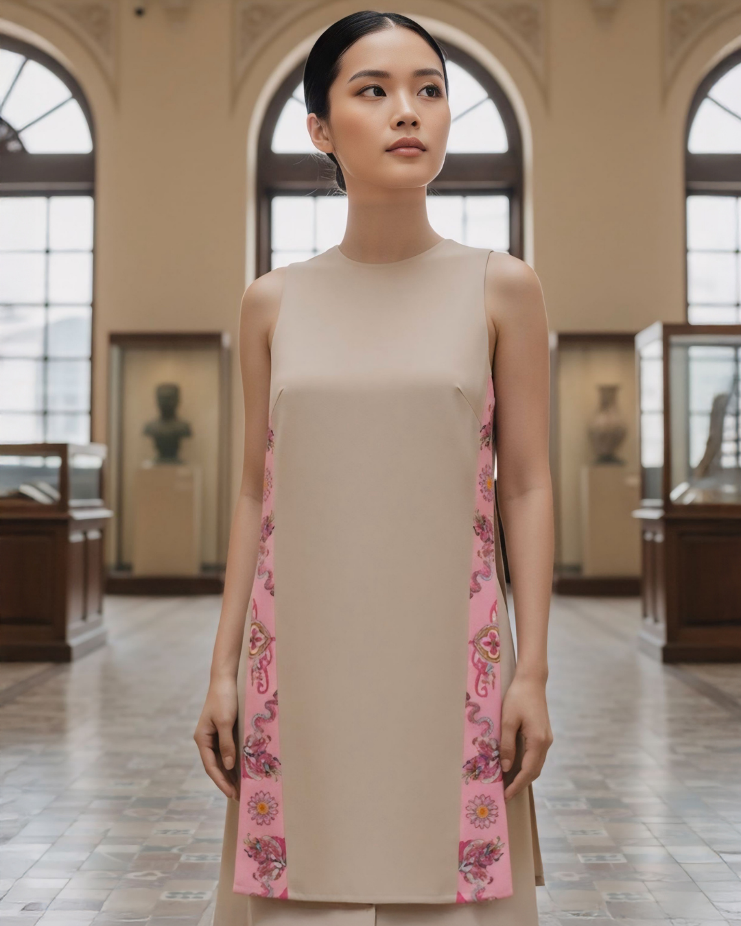 Bộ Lụa Dáng A Không Tay / Họa tiết Lụa Trơn Be Hồng & Twilly Phụng Vũ Vân Ca Hồng