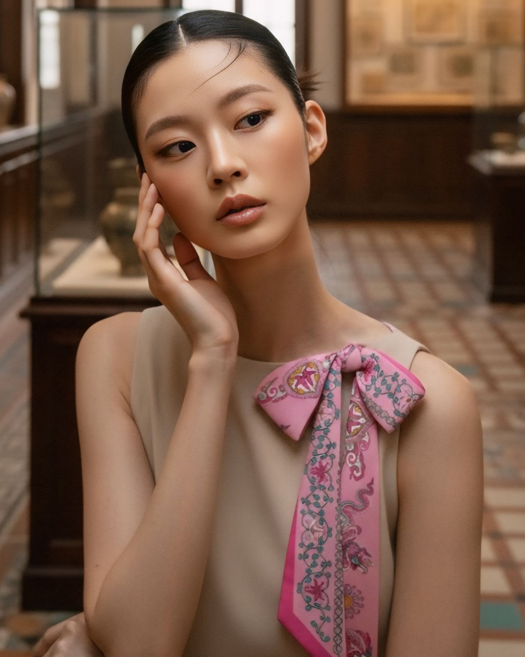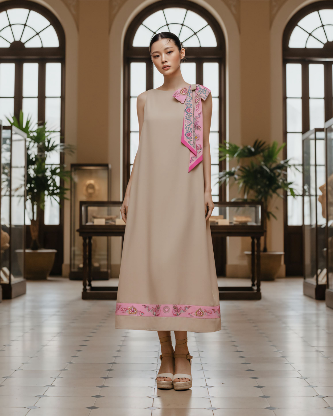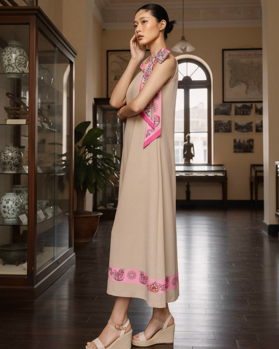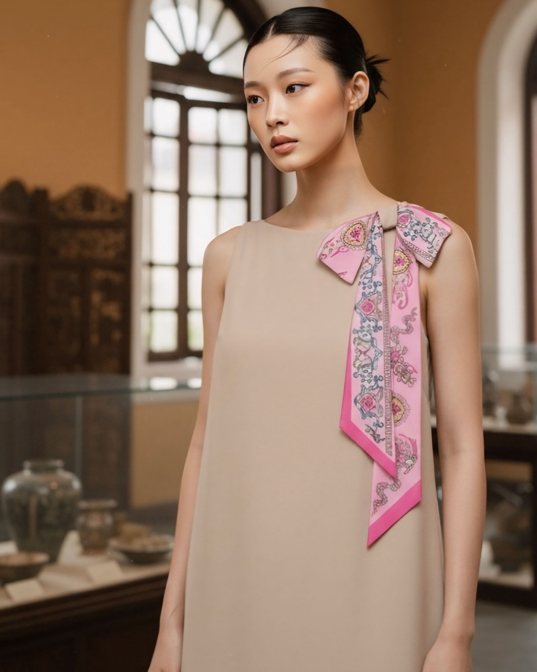 Mỗi thiết kế đều là tấm toan nguyên bản để tôn lên khí chất người mặc, với những điểm nhấn từ khăn Twilly tinh xảo – nơi “chữ ký” của Lý Quốc được thổi hồn vào từng chi tiết. Khiêm tốn mà sâu sắc, mỗi chiếc khăn trở thành một ngôn ngữ riêng, kể câu chuyện di sản bằng phong cách hiện đại.