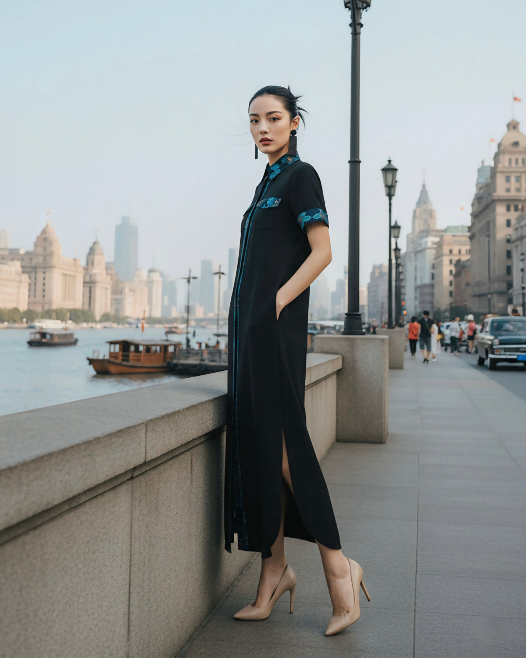 Đầm Sơ Mi Lụa Xẻ Tà Dáng Suông / Họa tiết Lụa Trơn Đen & Twilly Mây Hoạ Long Ân Xanh Dương