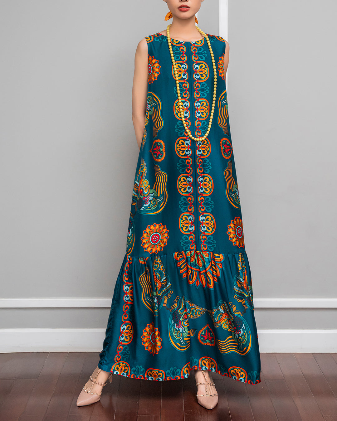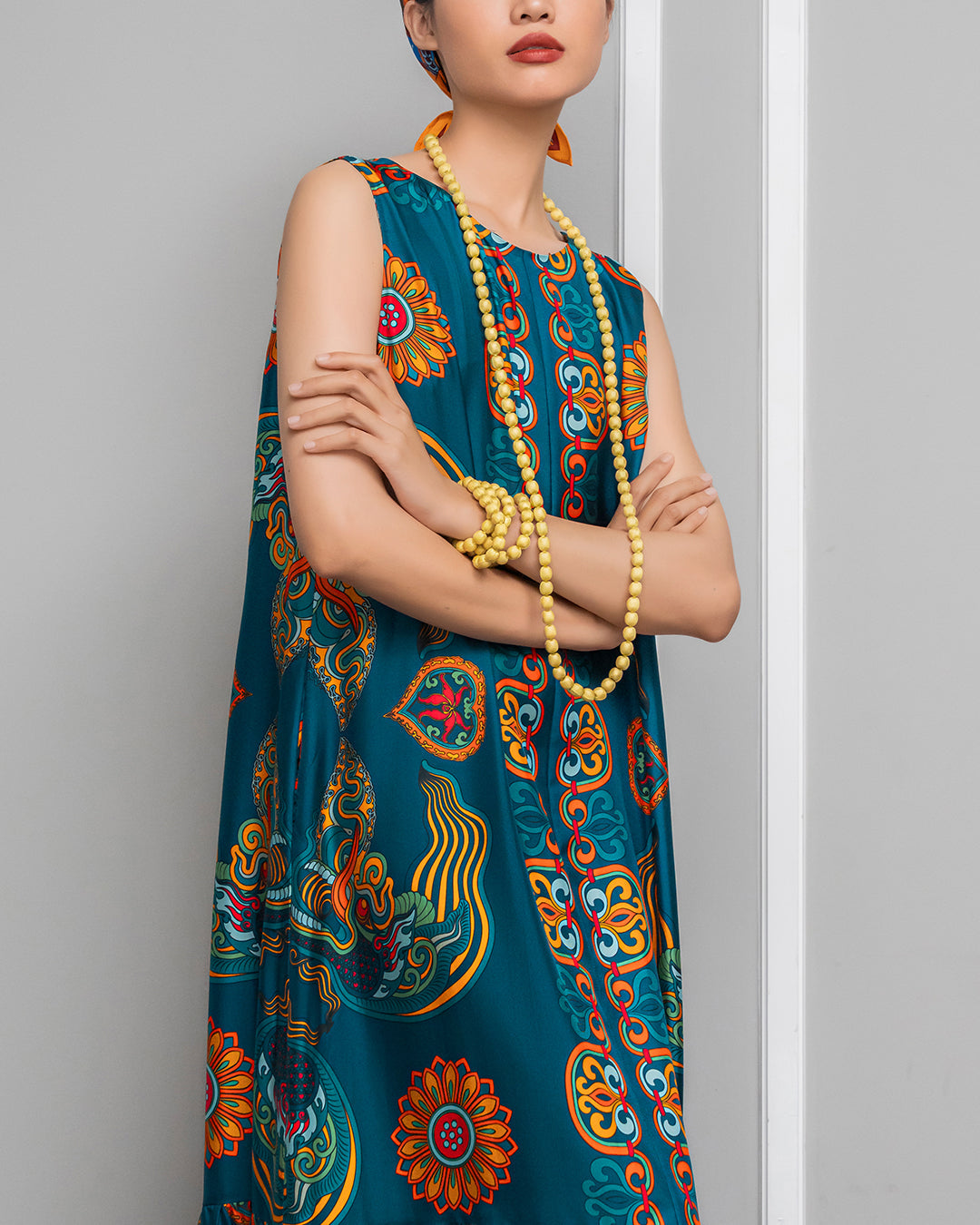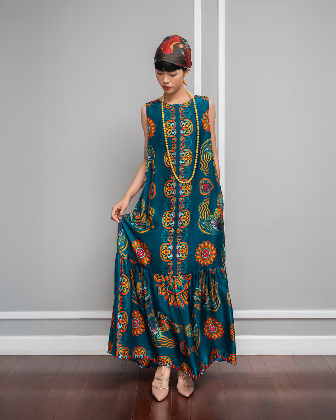 Đầm Max Boho Lụa 1970 Không Tay / Hoạ tiết Mây Hoạ Long Ân Xanh Cổ Vịt