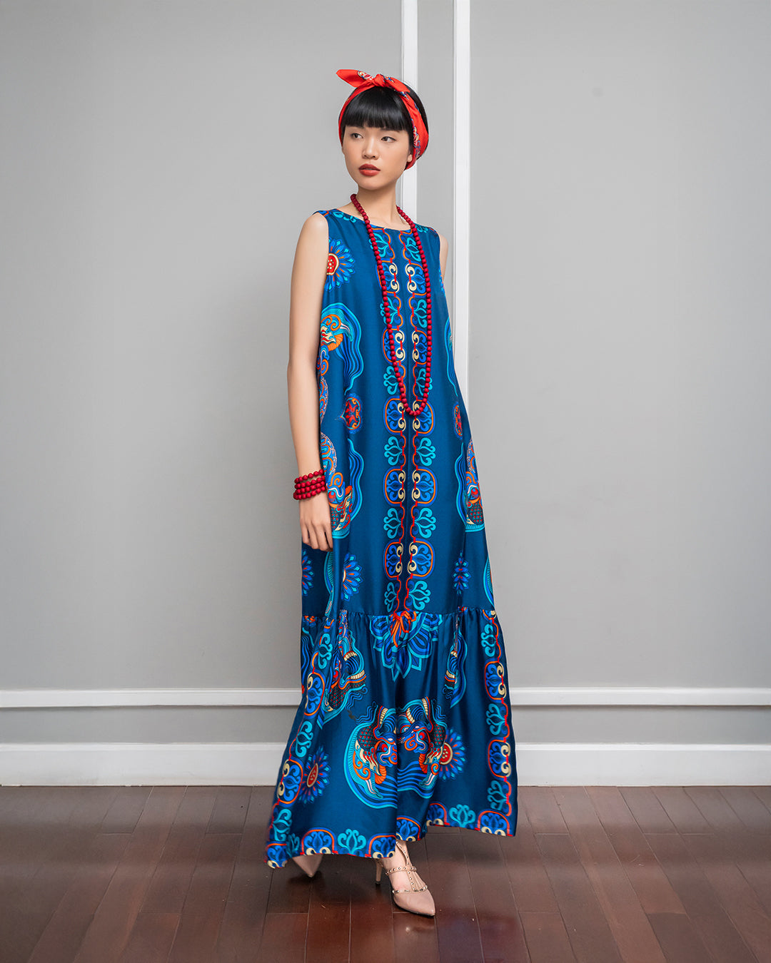 Đầm Max Boho Lụa 1970 Không Tay / Hoạ tiết Mây Hoạ Long Ân Xanh Dương