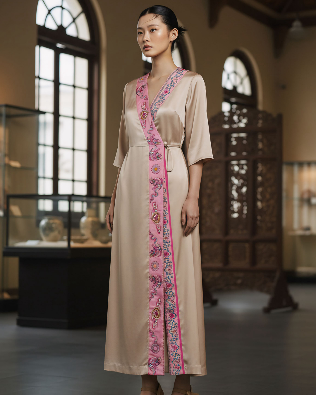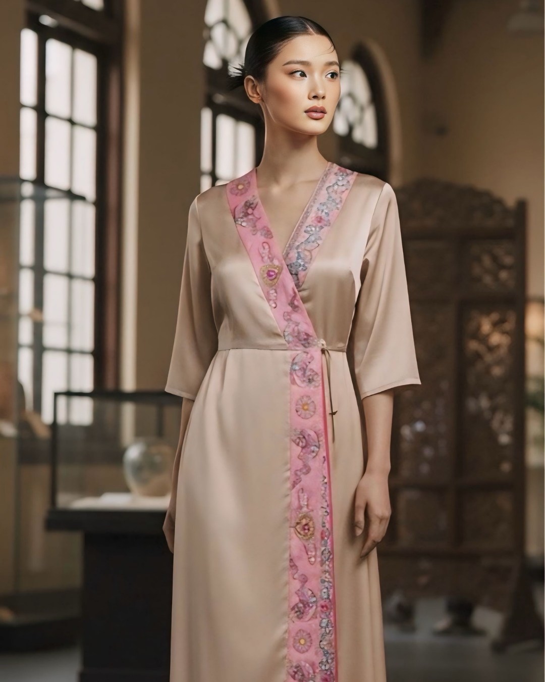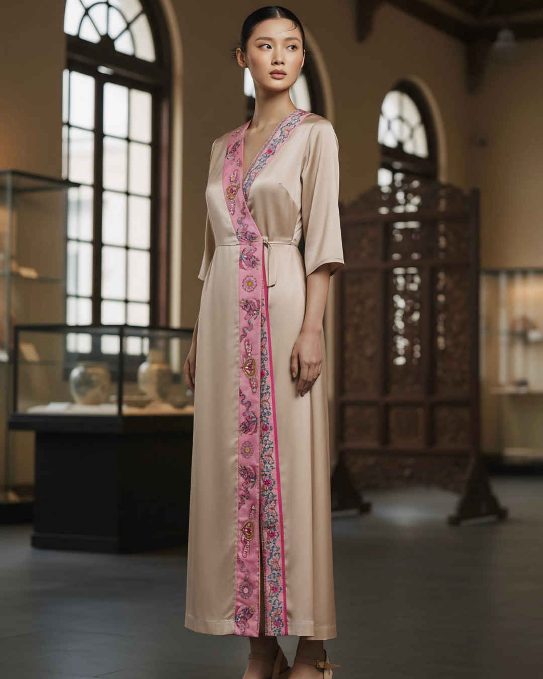 Đầm Quấn Lụa / Họa tiết Lụa Trơn Be & Twilly Phụng Vũ Vân Ca Hồng