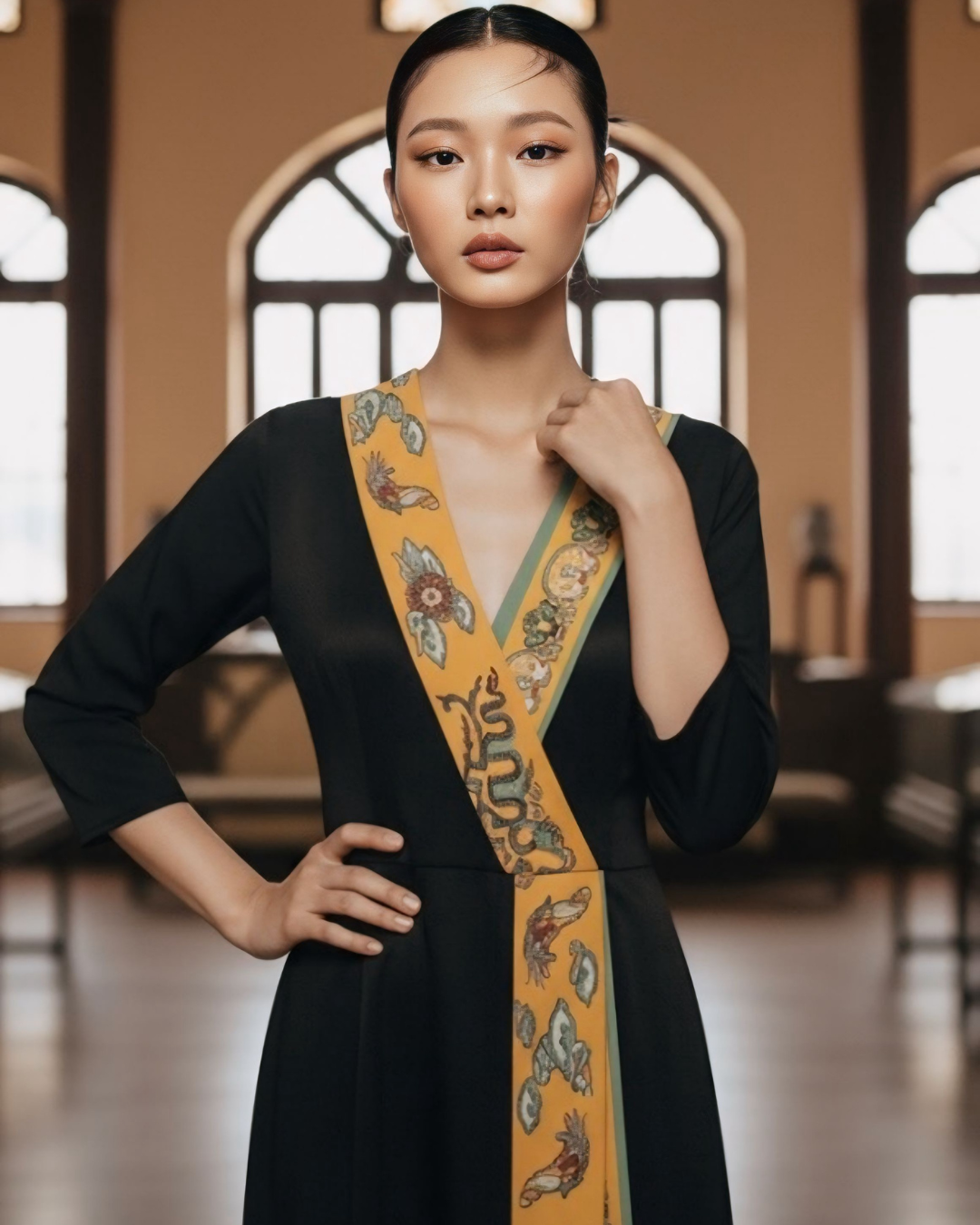 Mỗi thiết kế đều là tấm toan nguyên bản để tôn lên khí chất người mặc, với những điểm nhấn từ khăn Twilly tinh xảo – nơi “chữ ký” của Lý Quốc được thổi hồn vào từng chi tiết. Khiêm tốn mà sâu sắc, mỗi chiếc khăn trở thành một ngôn ngữ riêng, kể câu chuyện di sản bằng phong cách hiện đại.