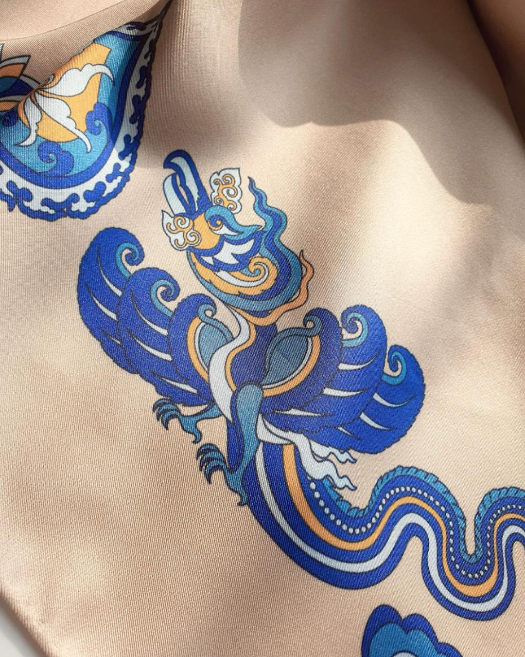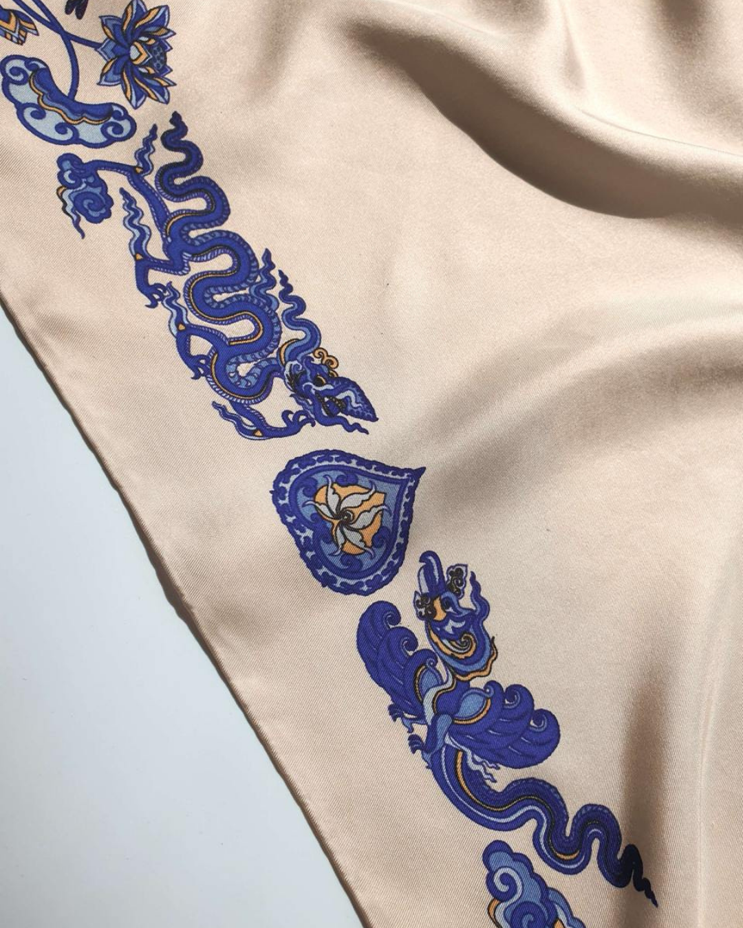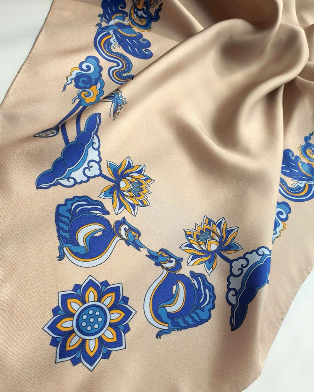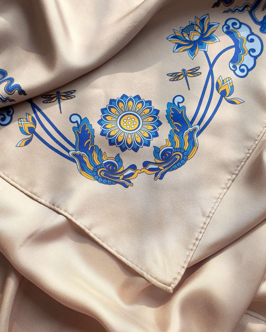 Lấy cảm hứng từ di sản triều Lý, hoạ tiết "Lý Quốc Ký Sự" tái hiện hình tượng Rồng thiêng, Quốc Sen, mây lành và chuồn chuồn – những biểu tượng của sức mạnh, trí tuệ và phúc lành. Trên nền lụa thượng hạng, đó là bản hòa ca giữa Quyền lực và An nhiên, đưa di sản sống động bước vào đời sống đương đại.