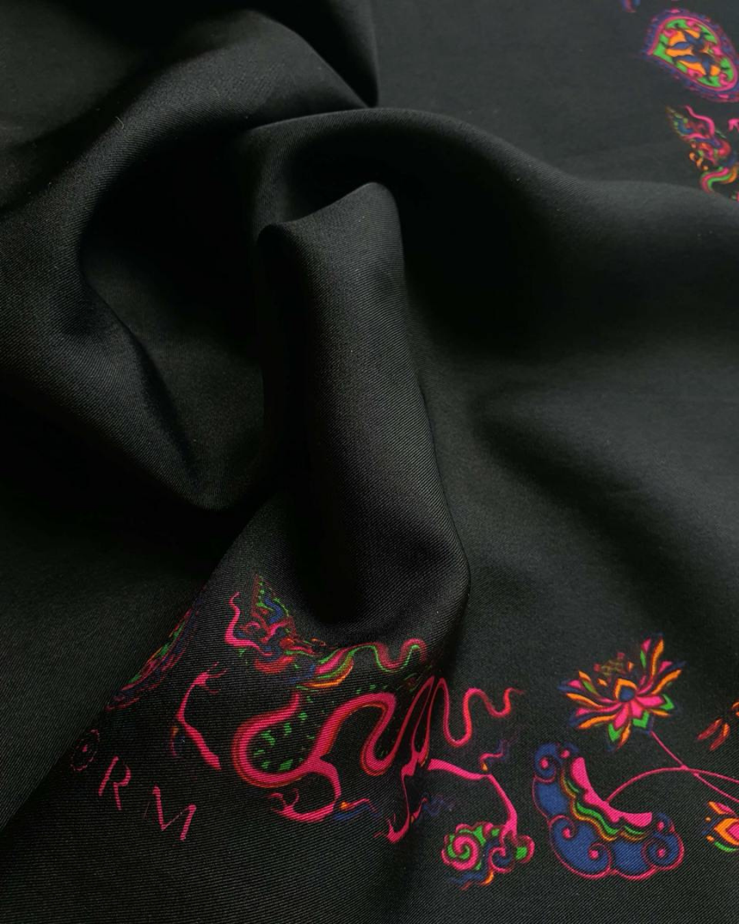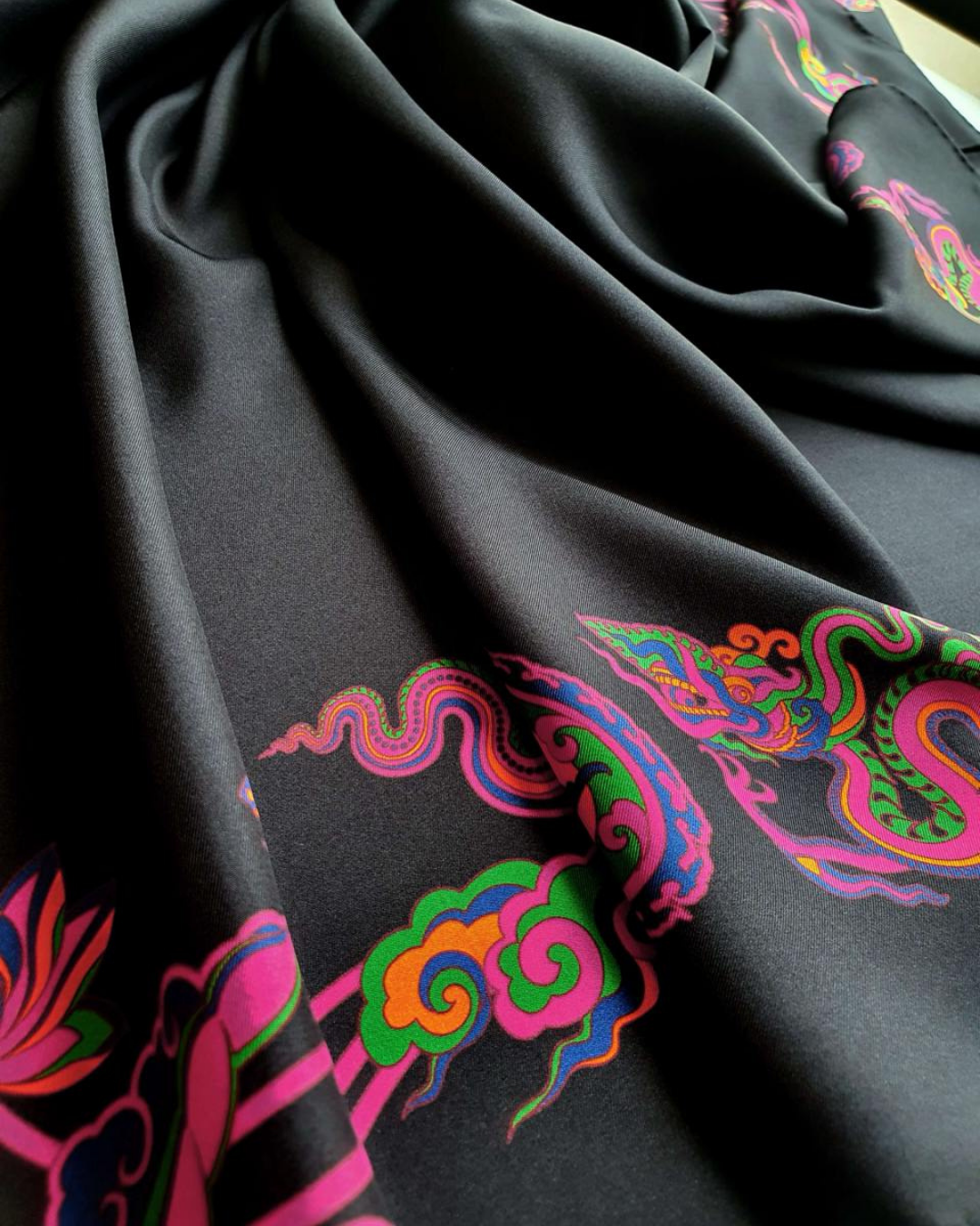 Lấy cảm hứng từ di sản triều Lý, hoạ tiết "Lý Quốc Ký Sự" tái hiện hình tượng Rồng thiêng, Quốc Sen, mây lành và chuồn chuồn – những biểu tượng của sức mạnh, trí tuệ và phúc lành. Trên nền lụa thượng hạng, đó là bản hòa ca giữa Quyền lực và An nhiên, đưa di sản sống động bước vào đời sống đương đại.