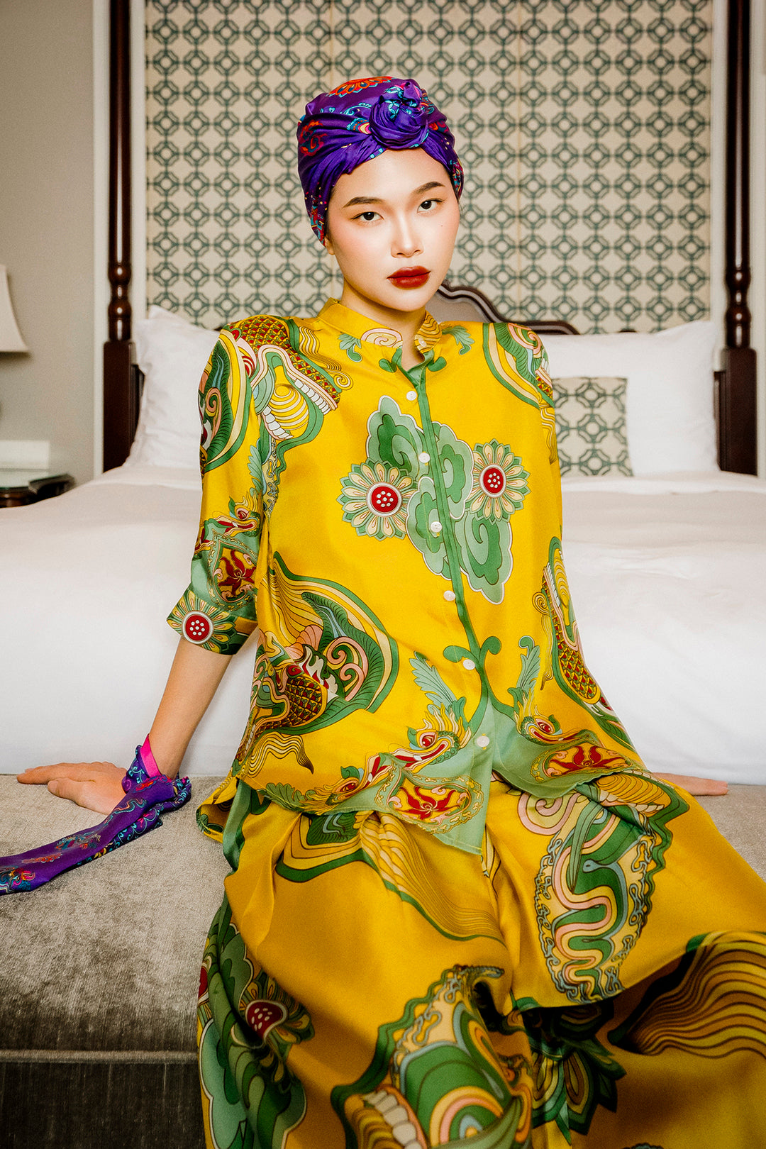 Khăn lụa tơ tằm "Mây Họa Long Ân" lấy cảm hứng từ hiện vật lịch sử thời Lý và được thiết kế với bố cục đối xứng tâm. Các hoạ tiết đầu rồng nối nhau, xen kẽ cùng biểu tượng hoa sen và lá đề trạm khắc và hướng về một đài sen lớn rực rỡ ở trung tâm, biểu trưng cho phước lành và trí tuệ ban xuống nhân gian. Những mẫu khăn với đường nét thanh thoát, sắc màu hài hoà như thổi hồn đương đại vào di sản cổ xưa, tôn vinh văn hóa Việt trên hành trình vươn tầm quốc tế.