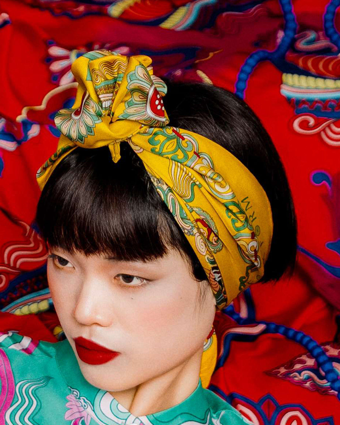 Khăn lụa tơ tằm "Mây Họa Long Ân" lấy cảm hứng từ hiện vật lịch sử thời Lý và được thiết kế với bố cục đối xứng tâm. Các hoạ tiết đầu rồng nối nhau, xen kẽ cùng biểu tượng hoa sen và lá đề trạm khắc và hướng về một đài sen lớn rực rỡ ở trung tâm, biểu trưng cho phước lành và trí tuệ ban xuống nhân gian. Những mẫu khăn với đường nét thanh thoát, sắc màu hài hoà như thổi hồn đương đại vào di sản cổ xưa, tôn vinh văn hóa Việt trên hành trình vươn tầm quốc tế.