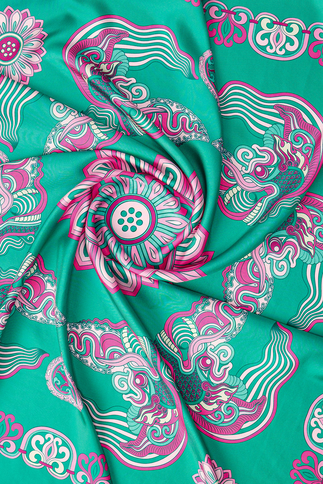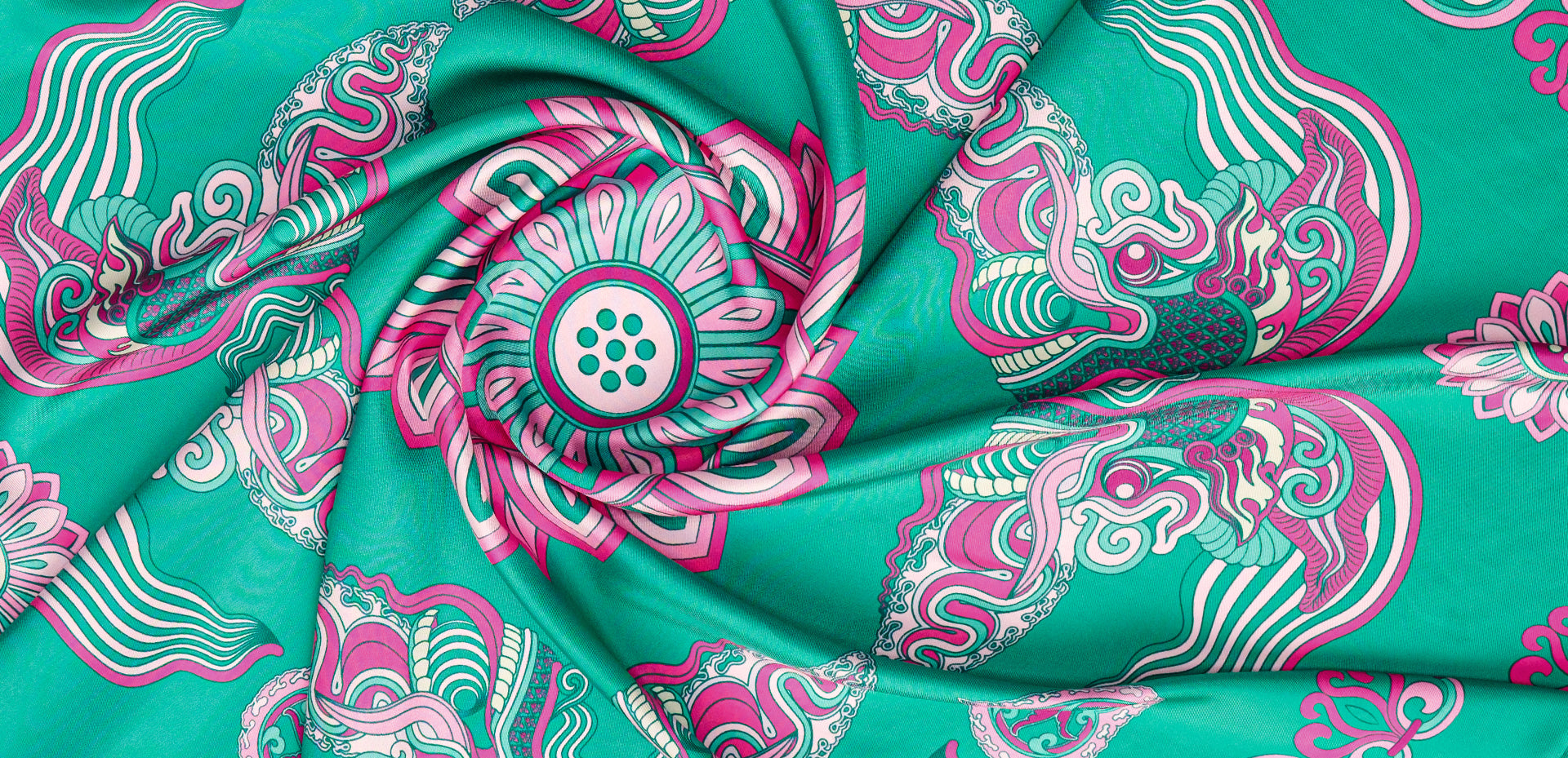 Hoạ tiết trên khăn là mẫu vẽ kỹ thuật số, được thiết kế để tương thích với phương pháp in lưới thủ công trên lụa.