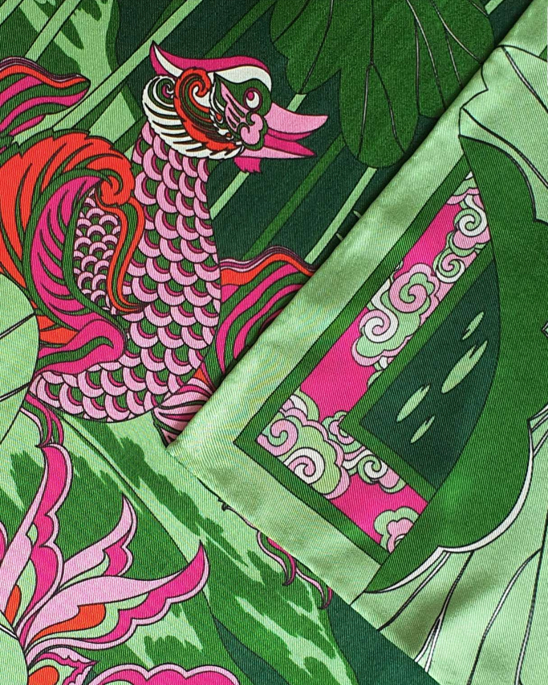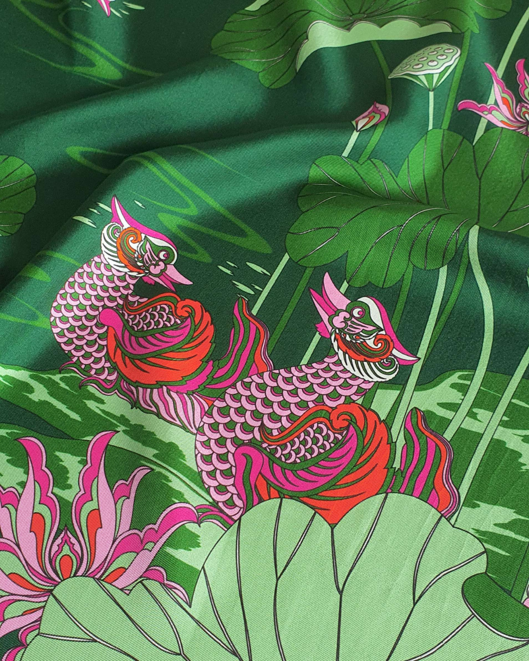 Lấy cảm hứng từ di sản thời Lý - Trần của Việt Nam, Khăn Lụa Uyên Ương Liên Hạ với hình ảnh đôi uyên ương và một đóa sen nở rộ - biểu tượng của tình yêu vĩnh cửu, sự thuần khiết và hạnh phúc bền lâu.