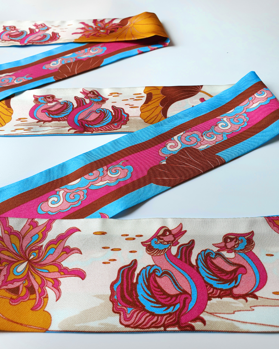 Quà Tặng Cao Cấp / Khăn Twilly Lụa Uyên Ương Liên Hạ / Be & Nâu / 6cm x 150cm