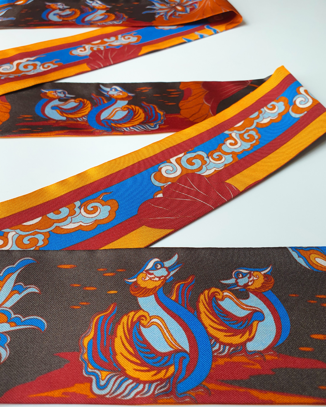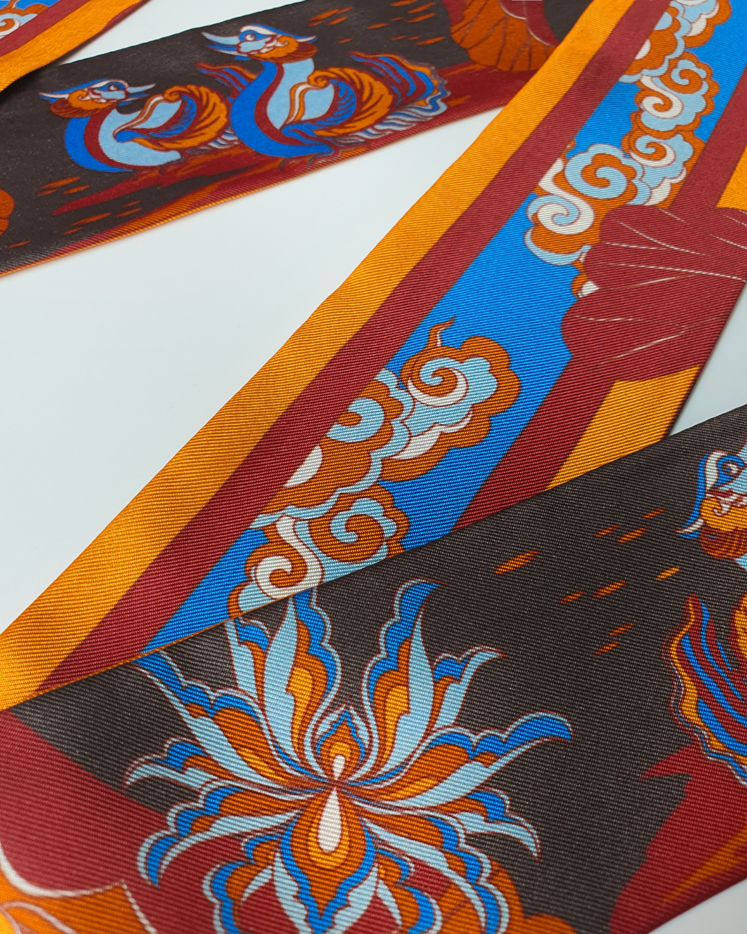 Lấy cảm hứng từ di sản thời Lý - Trần của Việt Nam, Khăn Lụa Uyên Ương Liên Hạ với hình ảnh đôi uyên ương và một đóa sen nở rộ - biểu tượng của tình yêu vĩnh cửu, sự thuần khiết và hạnh phúc bền lâu.