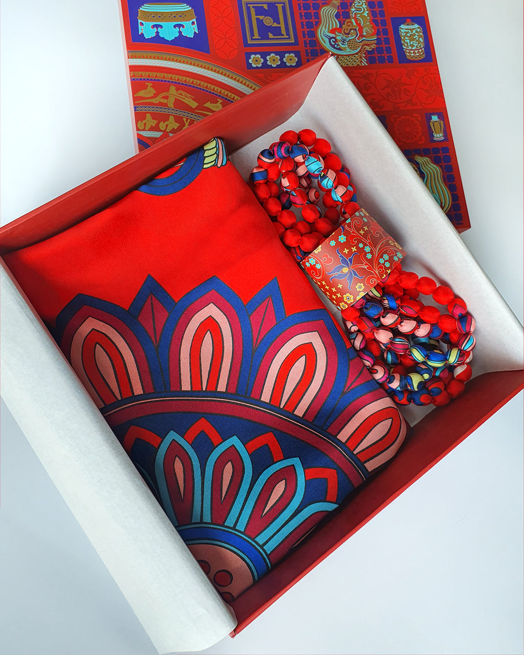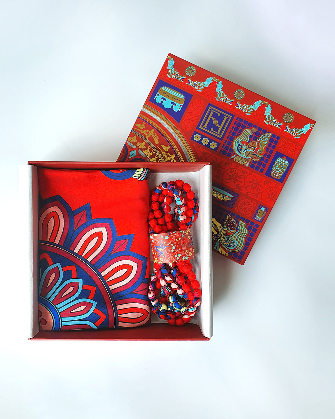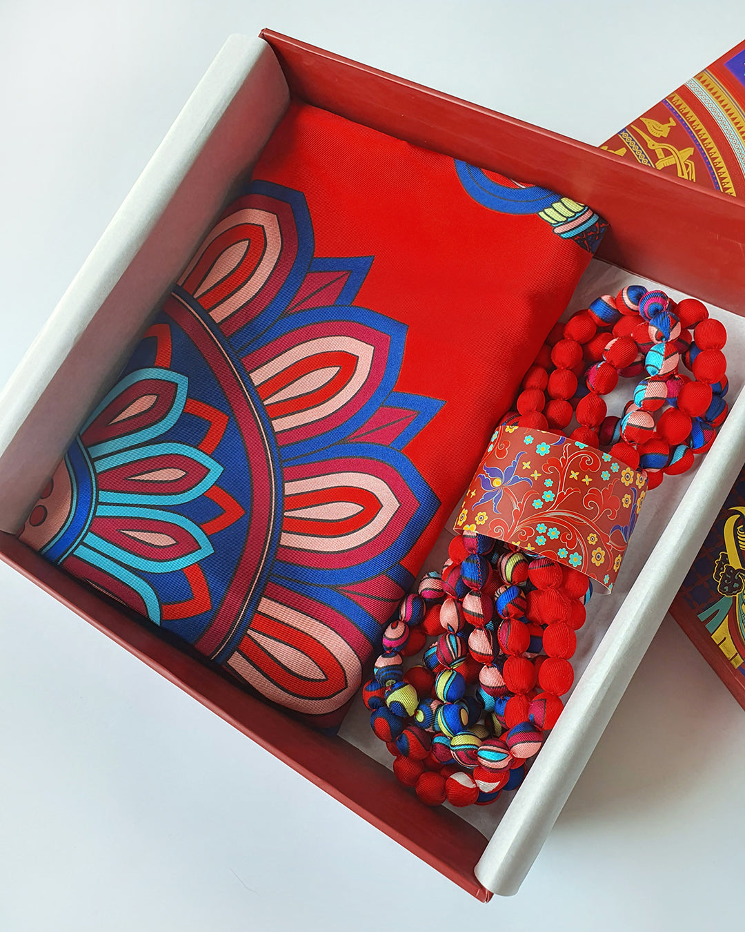 Khi bạn chọn một món quà chính (khăn lụa, cà vạt, sản phẩm thời trang...), chúng tôi sẽ thay bạn gửi gắm thêm sự đủ đầy bằng cách thân mời bạn chọn trong kho vật phẩm những món quà đi cùng trong set quà, có thể là Cài khăn sừng thủ công, Khăn, Vòng, Thời trang Linen, Thiệp theo thiết kế, Câu chuyện sản phẩm... hoặc những vật phẩm tinh tế khác.